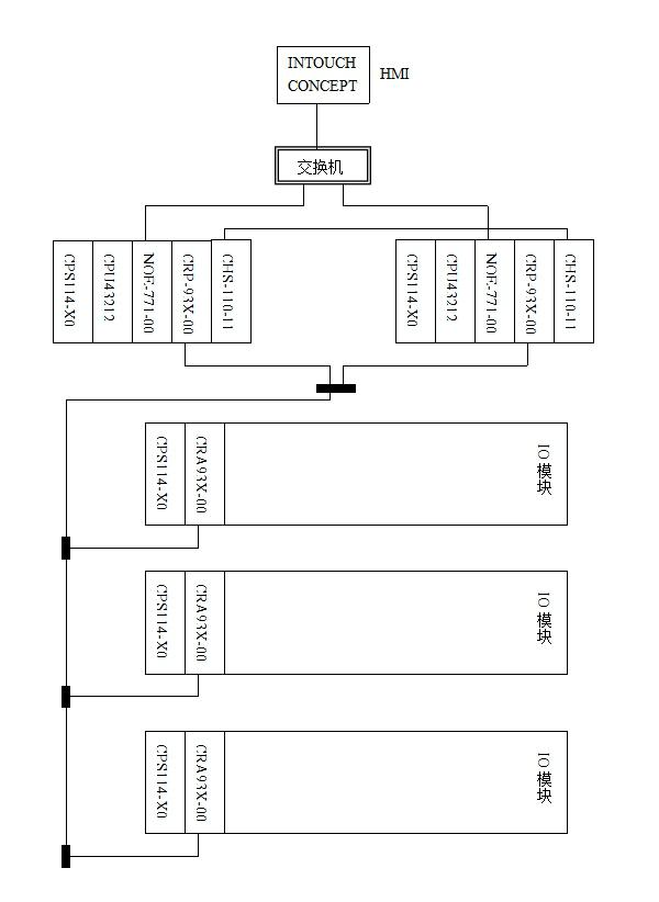 系统硬件采用施耐德Quantum系列PLC,组态软件采用施耐德自己开发的Concept2.0软件;画面编制采用Wondeware公司的INTOUCH9.0;INTOUCH与PLC的通讯采用以太网MODIBUS协议;