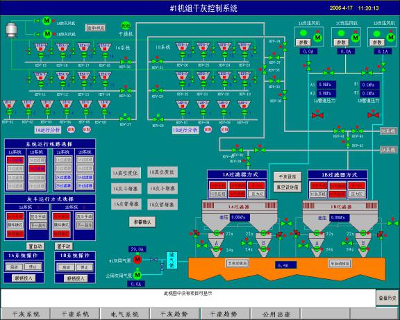 灰处理湿出灰改干出灰的改造也是提高灰处理控制系统改造的自动化水平的改造,此次改造中用PLC技术代替了继电器控制系统,使得灰处理控制系统自动化水平提高成为可能。在本次改造中益达设置了1号机组单元灰处理PLC控制系统一套,负责干灰收集系统、干渣收集、干渣压送系统的控制,在1号机EP室设一台工控机为单元灰处理PLC提供操作界面;设置一套公用PLC控制系统,负责三台机组的干灰压送、干渣压送管道切换、协调6台空压机的运行等,在1号机灰压送室设一台工控机为公用灰处理PLC提供操作界面。