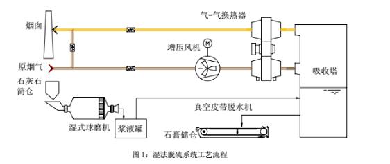 锅炉引风机排出的烟气通过布袋除尘器除尘后,经增压风机增压以克服脱硫系统的阻力,进入烟气换热器(GGH)进行降温,降温是为保护吸收塔的内部结构。经降温的烟气进入吸收塔与喷淋的石灰石浆液接触,烟气中的二氧化硫与浆液中的碳酸钙以及加入的氧化空气进行化学反应,最后生成二水石膏,由吸收塔排浆泵排出,进入一、二级石膏脱水系统,最后由传送带运至石膏储仓。脱硫后的净烟气依次经过除雾器除去水滴,再经过烟气换热器加热升温后,通过原有烟囱排入大气。湿法脱硫系统工艺如图1。