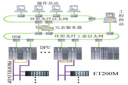 b) 益达以太网层:同样由 OSM 构成的环形光纤网络,把服务器和工程师站配置的通讯处理器(CP1613)和 5 个控制系统主站(DPU)配置的通讯处理单元(CP 443-1)连接起来,实现服务器、工程师站与各控制系统主站的 CPU 之间的通讯。