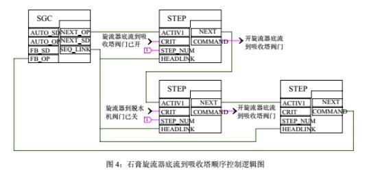 辅机的联锁保护和启停控制以及一些主要阀门的开闭控制由 DCS 中的开关量顺序控制系统(SCS)来完成,实现功能组或子组级的控制,以减轻运行人员劳动强度防止误操作。比如石膏旋流器底流到吸收塔的顺序控制: