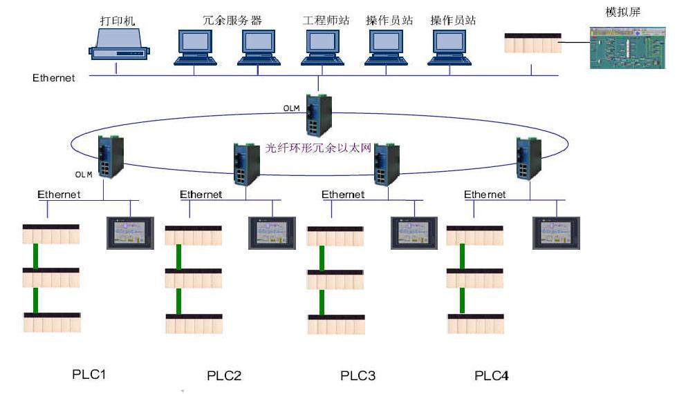 Ø 根据以上特点,本系统选用西门子 S-300 系列的中小型 PLC 对各工艺段或设备分散控制,通过以太网组成网络,各工艺段控制室和中控室设置上位机,构建人机界面进行生产管理和对生产数据进行后续处理。全厂控制网络如系统结构图所示。