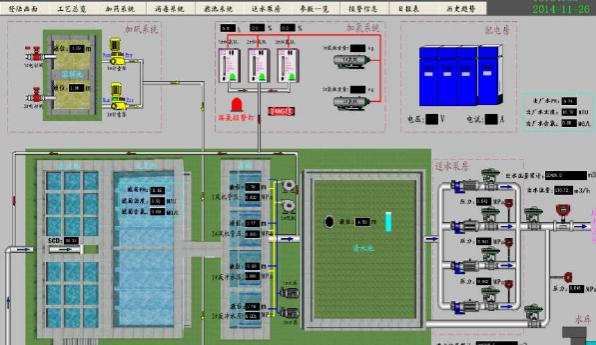 A. 总画面:表现的是整个水厂的水处理工艺(立体图形式),从取水、投药、投氯、絮凝沉淀、过滤到供水。在相关位置显示水处理的各主要控制参数以及重要设备的主要控制参数,可以点击进入各分站。