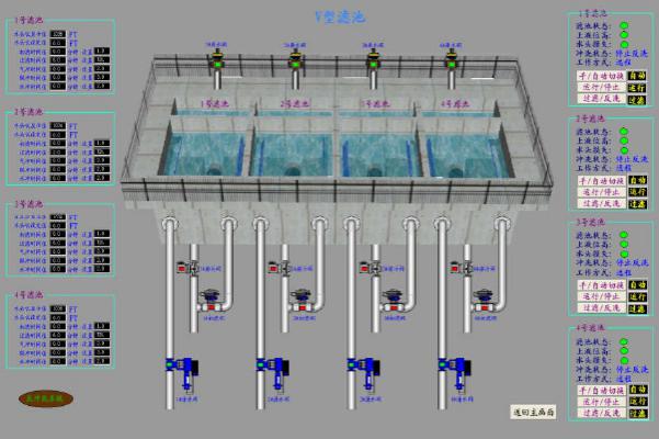 ⑶ 可集中控制整个水厂的水工艺的全自动过程,比如:加药、加氯和过滤池等水处理环节,使水处理更加准确和完备,同时能够自动对整个处理过程和处理情况进行监测和控制;
