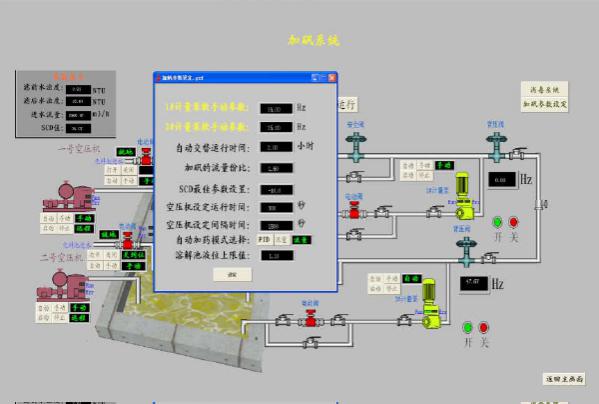 该系统人机界面由若干个画面组成:总画面(水厂水处理工艺)、各系统工艺图、报表窗口、报警窗口等。为增加画面的可读性和可观赏性,主要画面均采用平面图形式,在画面的相关位置显示该设备的所有主要运行参数。设备的控制通过点击该设备进入,