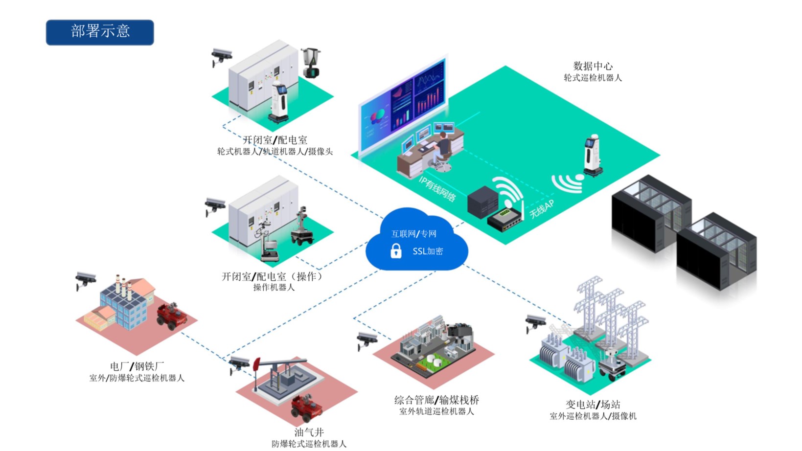 益达智能机器人系统可广泛应用于电力变电站、冶金化工园区、综合管廊、数据中心等各种应用场景。